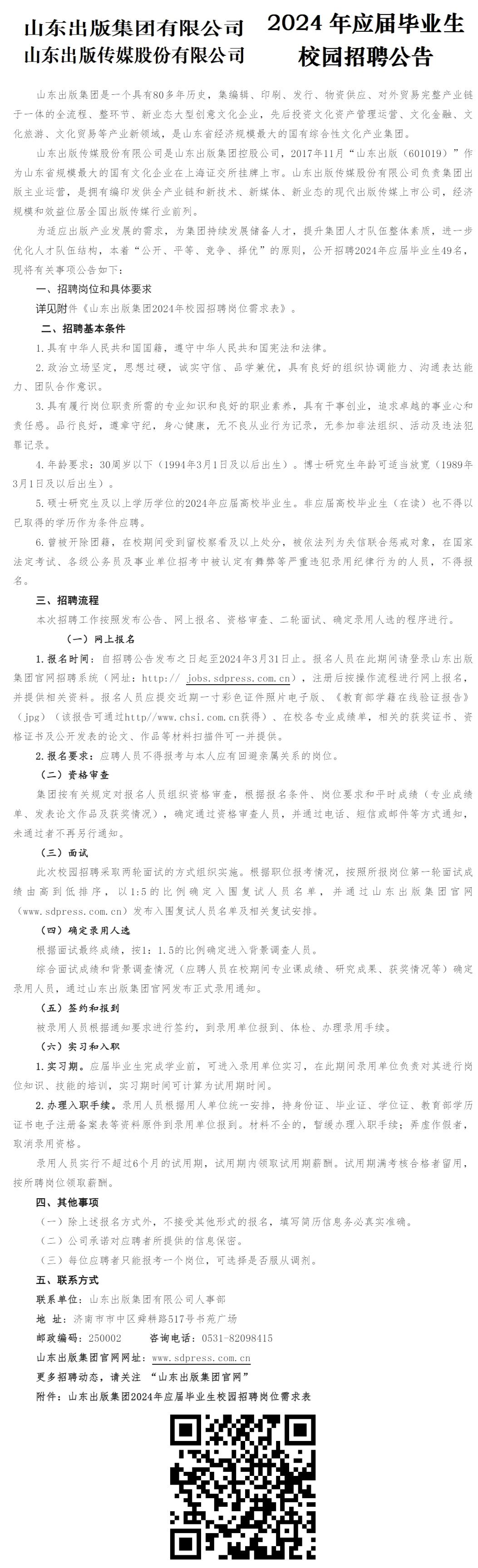 山东出版集团2024年校园招聘公告!