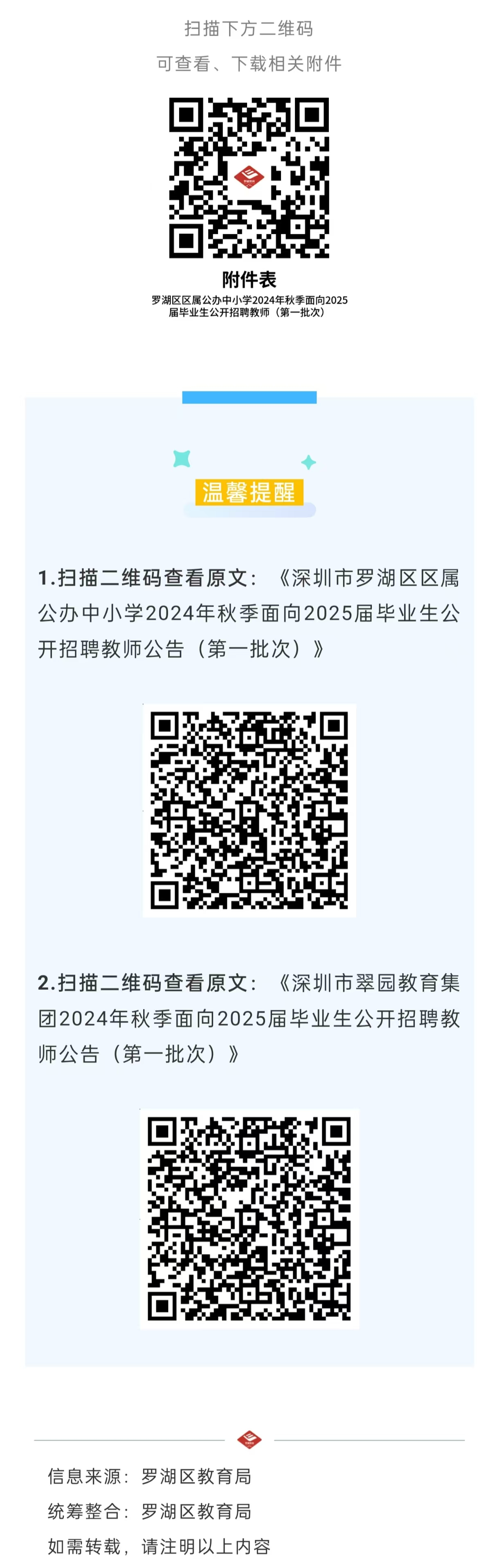 深圳市罗湖区区属公办中小学是深圳市罗湖区教育局下属事业单位,涵盖义务教育、高中以及中职教育。罗湖区教育局2024年秋季面向2025届毕业生定点公开招聘教师(第一批次)共274名。其中,翠园教育集团赴北京市招聘40名教师,具体岗位详见相关公告;其他区属公办中小学赴上海市、济南市招聘234名教师,具体岗位详见《深圳市罗湖区区属公办中小学2024年秋季面向2025届毕业生公开招聘教师岗位表(第一批次)》(附件1,以下简称《招聘岗位表》)。现就有关事项公告如下: