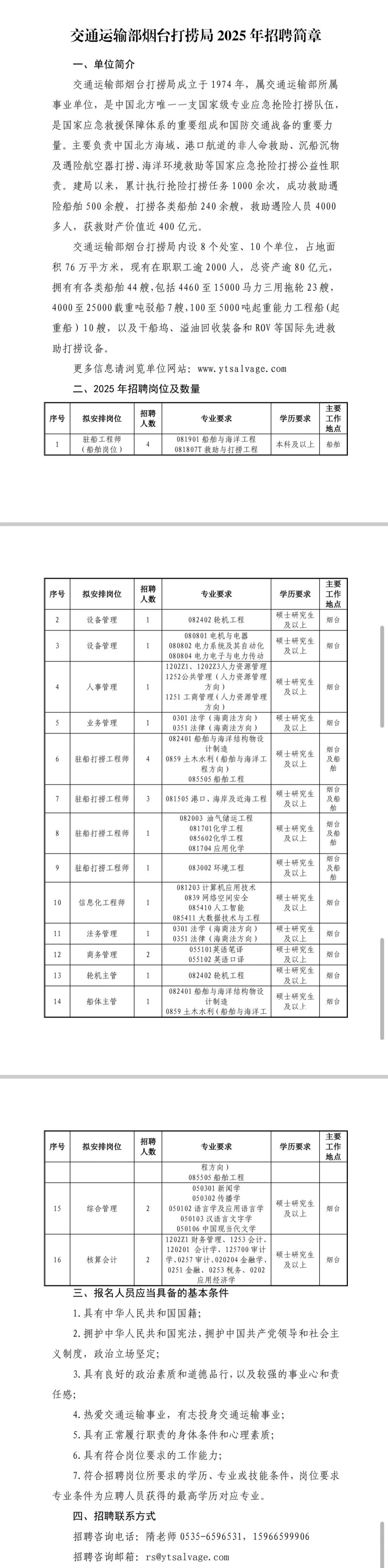 交通运输部烟台打捞局2025年招聘简章